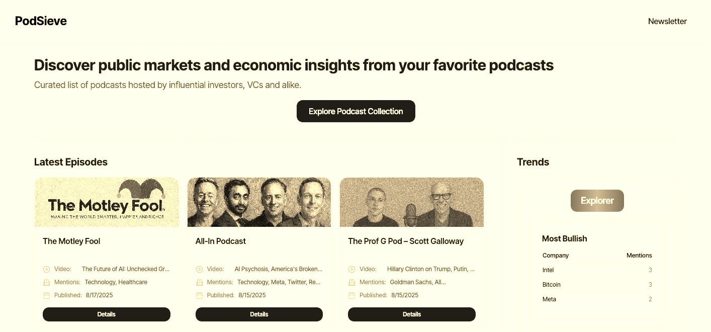 A website that displays insights on public companies by scanning niche & curated list of podcasts/channels.